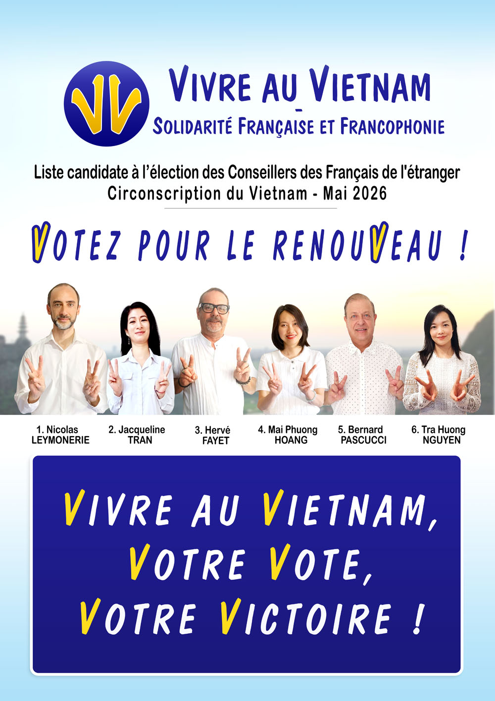 Voici l’affiche de la liste Vivre au Vietnam que vous verrez au bureau de vote de Hanoï ou HCM-Ville si vous optez pour le vote à l’urne. Votez pour le Renouveau !