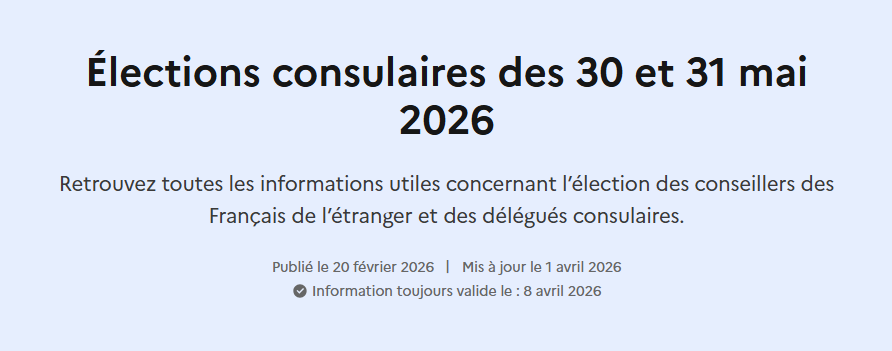 Les informations de la représentation diplomatique française au Vietnam : https://vn.diplomatie.gouv.fr/fr/elections-consulaires-2026-au-vietnam , https://vn.diplomatie.gouv.fr/fr/citoyennete/elections-consulaires-des-30-et-31-mai-2026